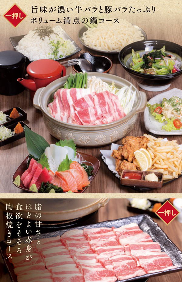 | 内容 | ・小鉢(大皿) ・鍋または陶板焼き ・刺身3点盛り ・揚げ物2点 ・サラダ ・お食事(うどん、雑炊のいづれか一点) |